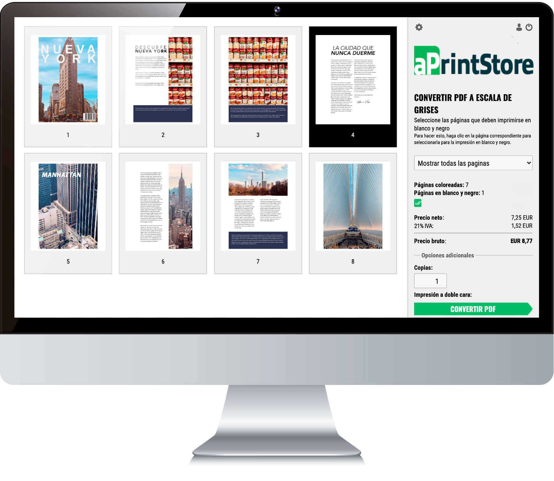 Print Editor ist auch ein PDF-Dateikonfigurator, mit dem verschiedene Projekte auf einfache und intuitive Weise vorbereitet werden können. Es verfügt über mehrere automatisierte Optionen, die eine vollständige Personalisierung des Druckprojekts ermöglichen, z. B. die automatische Auswahl der Seiten, die nur in schwarzweiß vorliegen, oder die Umwandlung von Farbseiten in Schwarzweiß.